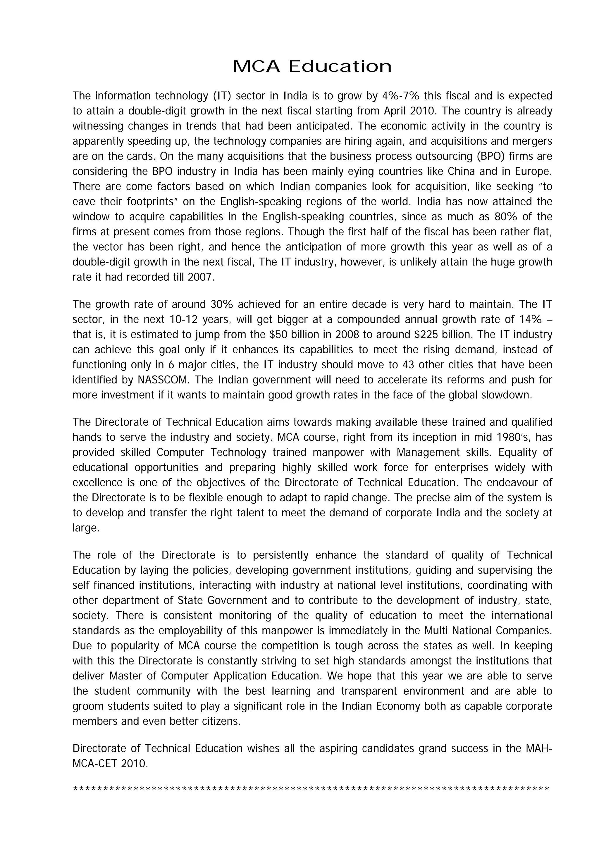 The IT sector in India is expected to grow 4-7% in the current fiscal year and achieve double-digit growth next year as the economic activity and hiring in the country is picking up. The BPO industry in India has been looking to acquire companies in countries like China and Europe to expand their footprint in English-speaking regions. The Directorate of Technical Education aims to provide skilled computer and management trained workforce to industry and society through the MCA program and ensure quality technical education in the state.