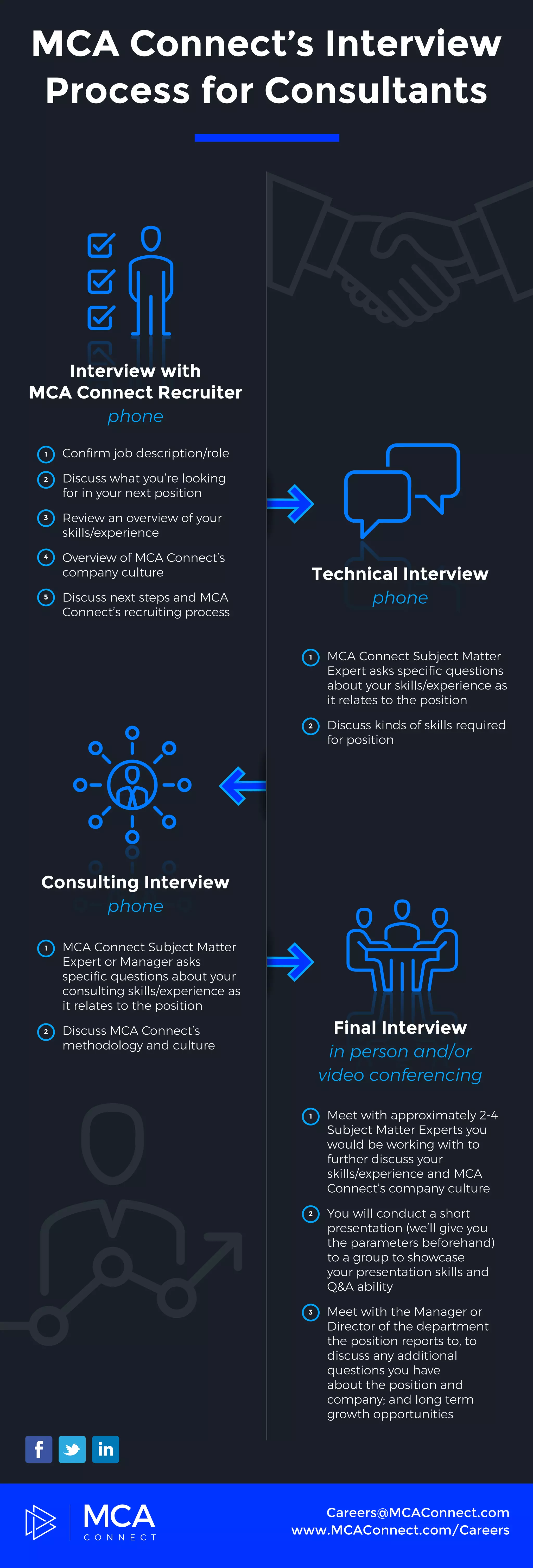MCA Connect's interview process for consultants involves confirming the job role, assessing skills and experience, and discussing company culture. It includes various interview stages with recruiters and subject matter experts, as well as a presentation to demonstrate skills. The process culminates in a manager or director meeting to address further questions and explore growth opportunities.