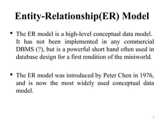 This document provides an overview of entity-relationship (ER) modeling concepts. It defines key terms like entities, attributes, relationships, and structural constraints. It also explains how to represent ER diagrams in a relational database using tables, keys, and relationships. Specific topics covered include entity types, attributes, keys, relationships, cardinality, participation constraints, weak entities, and ER diagrams. Examples are provided to illustrate concepts like entity sets, relationship types, and many-to-many relationships.