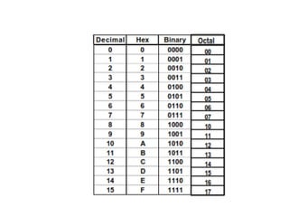 Digital systems use discrete binary values of 0s and 1s rather than continuous values. The binary number system represents numbers using a base-2 system with two digits: 0 and 1. Decimal, octal, and hexadecimal systems can be converted to and from the binary system using tables or repeated division/multiplication operations. Binary subtraction is performed using 1's or 2's complement representations of negative numbers, which involve inverting and adding 1. Digital circuits employ these binary representations and arithmetic operations to perform computations.