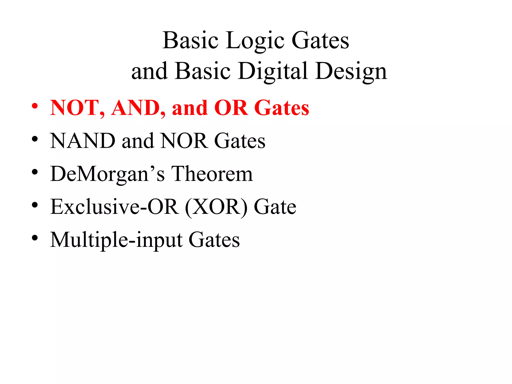 This document provides an overview of basic digital logic circuits including NOT, AND, OR, NAND, NOR, XOR, and XNOR gates. It describes the truth tables and logic expressions for each gate. De Morgan's theorems are explained which allow converting between AND/OR and NAND/NOR logic. Multiple input gates such as AND, OR, NAND and NOR are also introduced. The document references common computer organization and digital design textbooks for additional information.