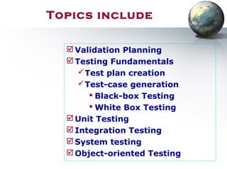 This document discusses various topics related to software testing and verification and validation (V&V). It begins with an overview of test plan creation and different types of testing such as unit, integration, system, and object-oriented testing. It then defines the key differences between verification and validation. The rest of the document provides more details on V&V techniques like static and dynamic verification, software inspections, and testing. It also covers testing fundamentals, principles, testability factors, and different testing techniques like black-box and white-box testing.