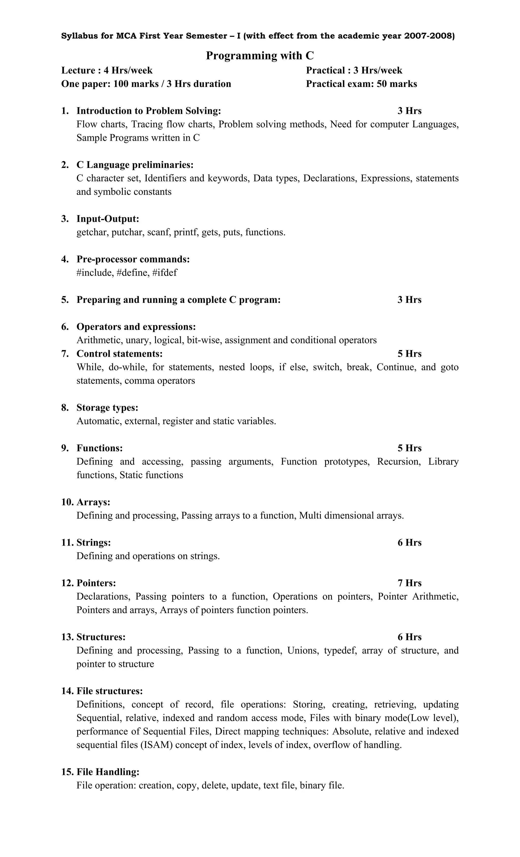 The document provides a syllabus for the first year semester 1 of an MCA program covering various subjects including Programming with C, System Analysis & Design, Computer Organization and Architecture, Discrete Mathematics, Principles of Economics and Management, and Introduction to Web Technology. Key topics covered in the subjects include programming concepts in C, system development lifecycles, computer hardware components, logical reasoning, economic principles, and basic web technologies like HTML. Lectures, practical sessions, exams and evaluations are included for each subject.