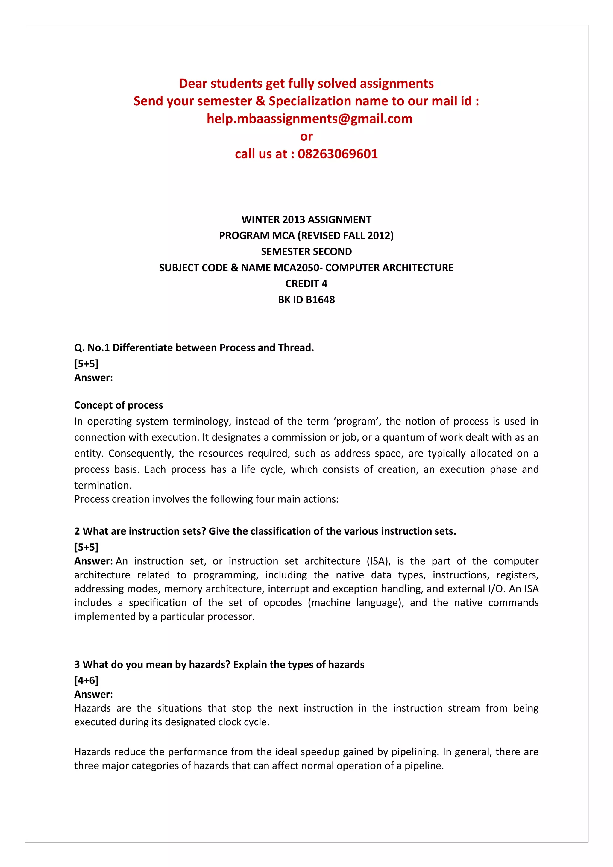 This document contains a series of assignment questions and their corresponding answers for a winter 2013 semester MCA program. Topics covered include computer architecture, communication skills, object-oriented programming, advanced data structures, and operating systems, with definitions, explanations, and comparisons related to key concepts in each subject area. Students are encouraged to contact the provided email or phone number for assistance with assignments.