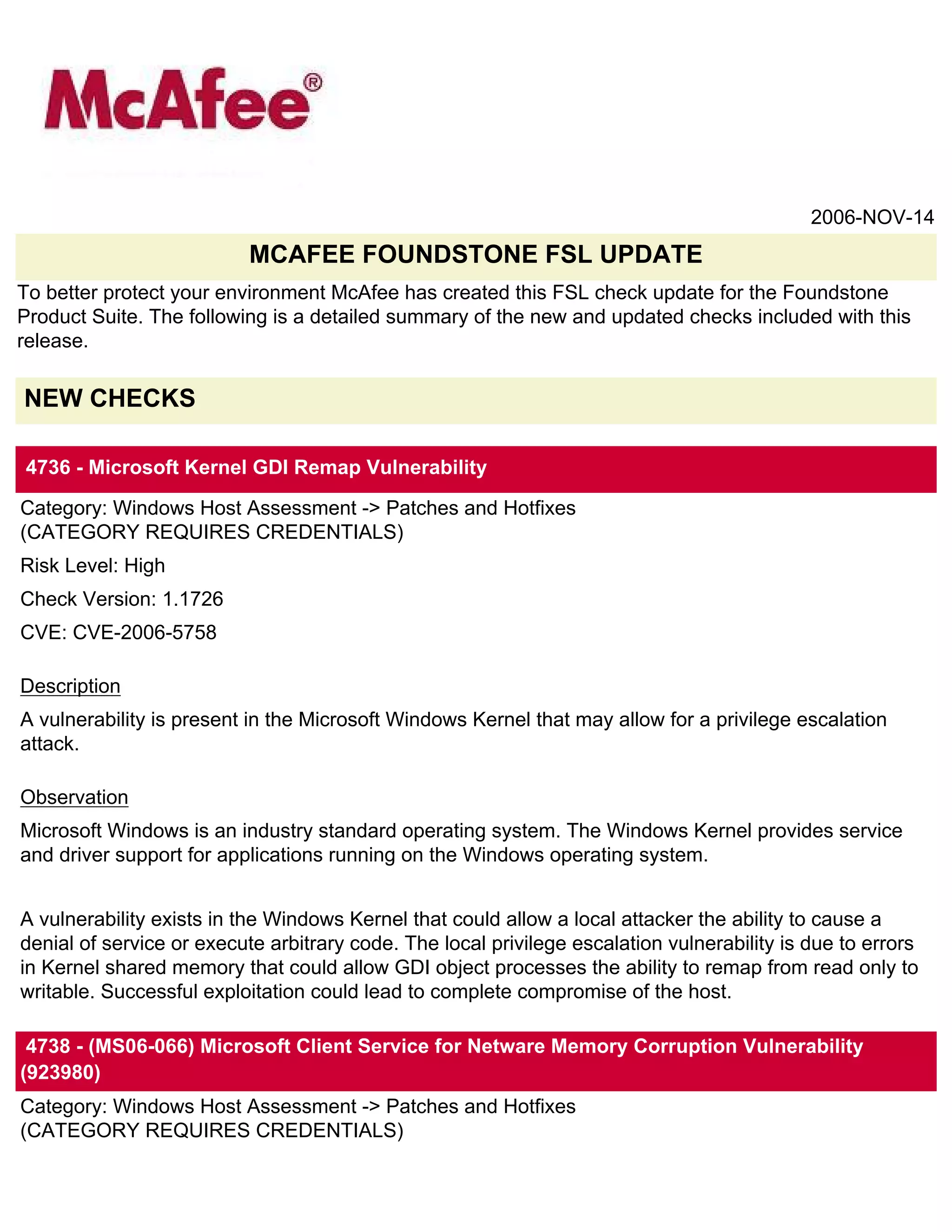 The document provides details of new and updated vulnerability checks released by McAfee for its Foundstone Product Suite. It summarizes 15 new checks for high and medium risk vulnerabilities in software like Windows, Cisco IOS, Mozilla Firefox, and Adobe Flash. It also lists enhancements made to 16 existing checks covering vulnerabilities in those programs as well as Apache and OpenSSL.