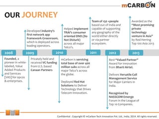 mcarbon Tech Innovation Pvt. Ltd. is a leading provider of value-added services for telecommunications companies, servicing over 400 million subscribers through innovative technology and products such as call management and customer engagement solutions. The company has received multiple awards for its contributions to the telecom sector, including recognition from Nasscom and Red Herring. With a strong emphasis on customer value management and operational efficiency, mcarbon aims to enhance revenue and improve customer loyalty for telecom operators worldwide.