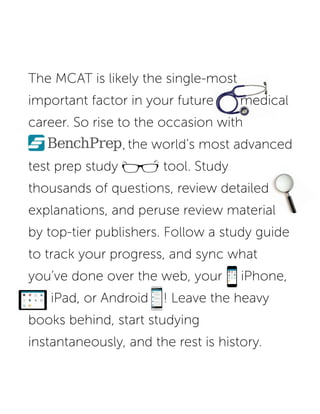 The document provides an overview of the MCAT and its upcoming changes in 2015, highlighting the new format that includes four sections and a greater emphasis on multidisciplinary knowledge and real-world applicability. It offers study strategies, preparation resources, and tips for test day, along with guidance on applying to medical school. Key points include the importance of the MCAT in determining future medical careers and the need for students to adequately prepare for its increased difficulty.