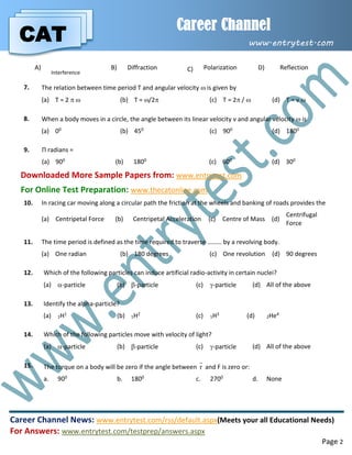 The document contains a series of physics and chemistry multiple-choice questions covering various concepts such as mechanics, thermodynamics, waves, and chemical properties. Each question provides four answer options, prompting the reader to select the most appropriate one. It serves as a sample test for students preparing for exams, specifically the MCAT and other science assessments.