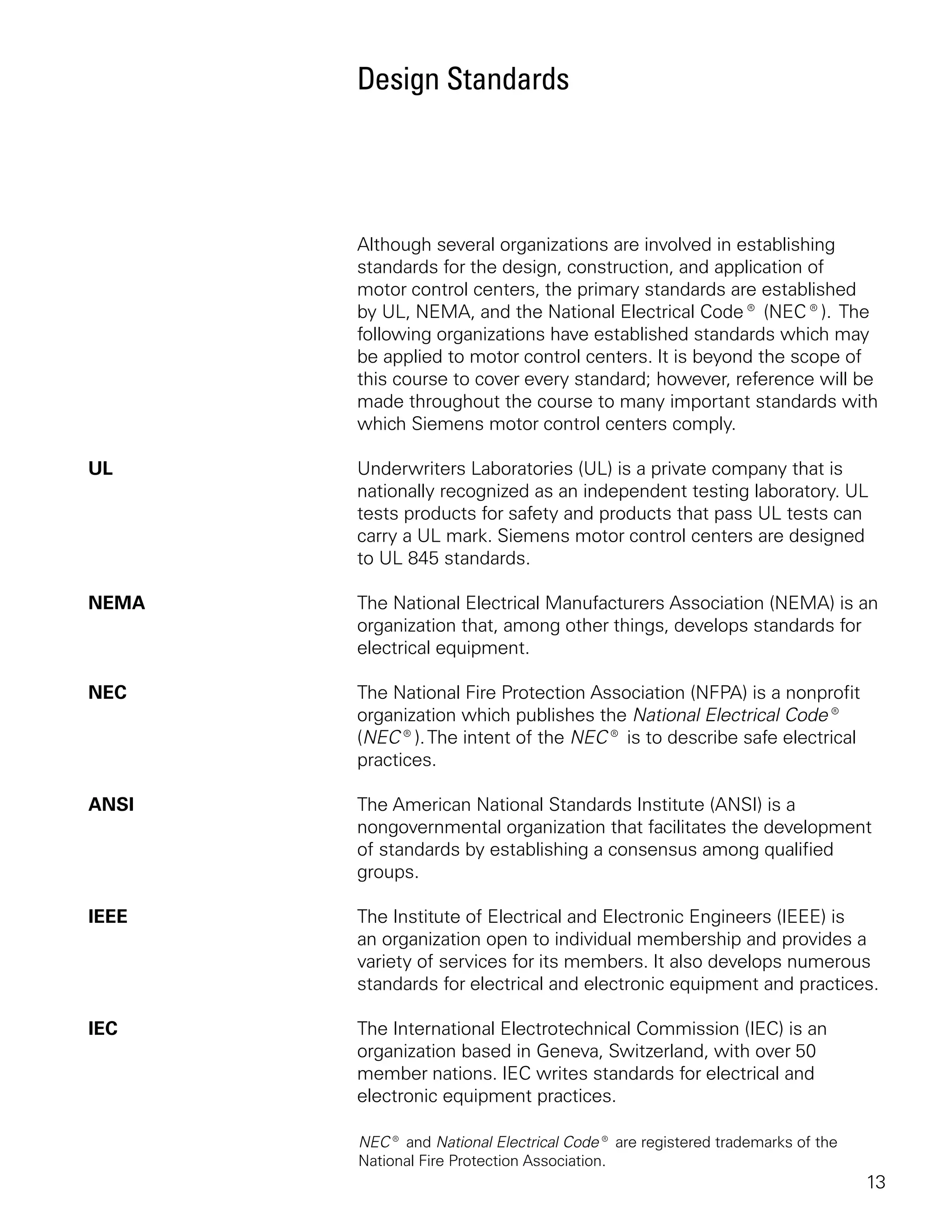 The document discusses standards for motor control center design, including those established by UL, NEMA, and the National Electrical Code. It also summarizes several other organizations that develop relevant standards, such as IEEE, IEC, and ANSI. Proper overcurrent protection of motor control centers is required for safety, as it prevents equipment damage from overloads, short circuits, and ground faults.