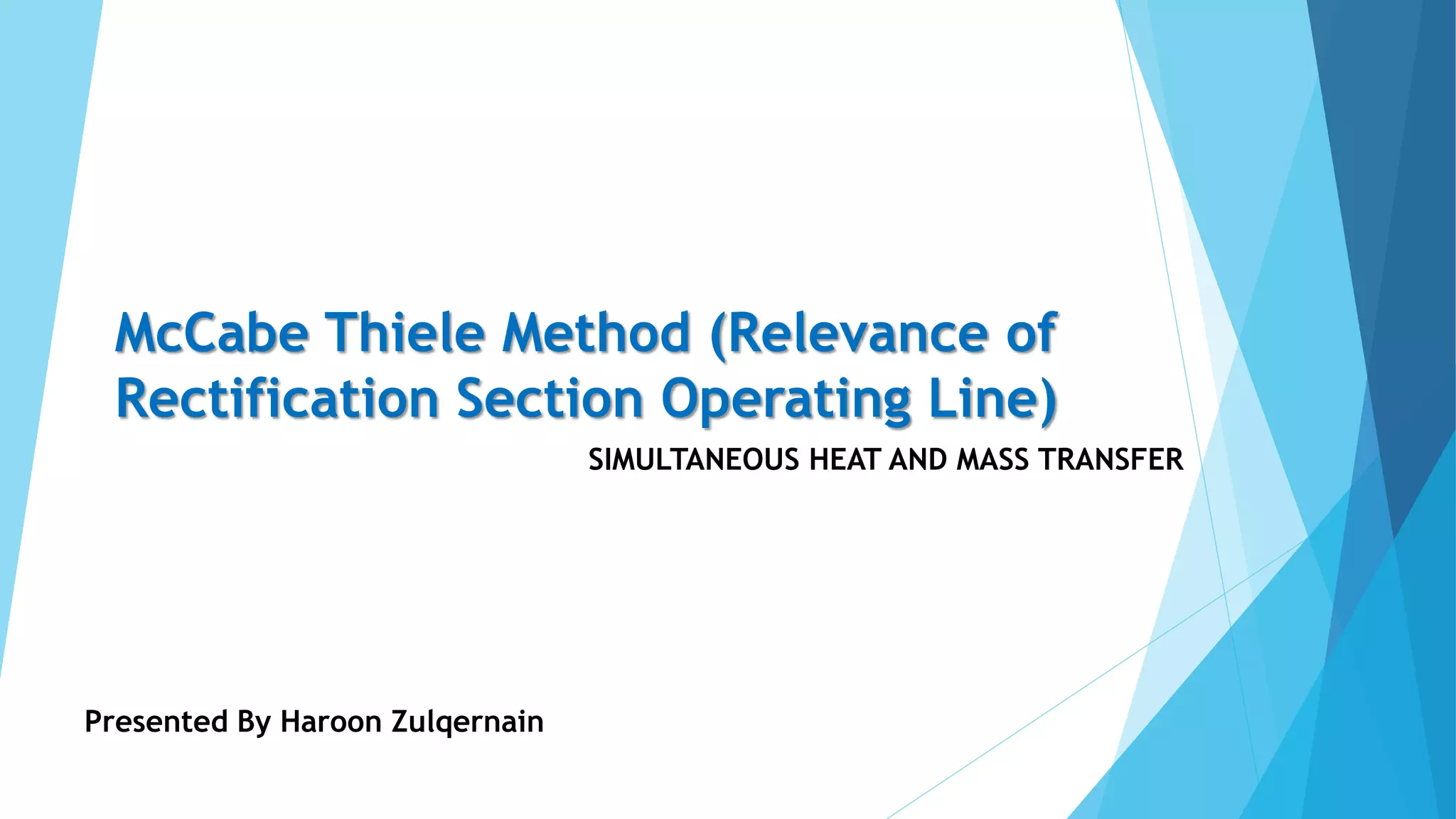 The document discusses the McCabe Thiele method for analyzing distillation columns. It begins by defining the rectifying section operating line (ROL) equation as yn+1 = (R/(R+1))xn + (1/(R+1))xD, where R is the reflux ratio.