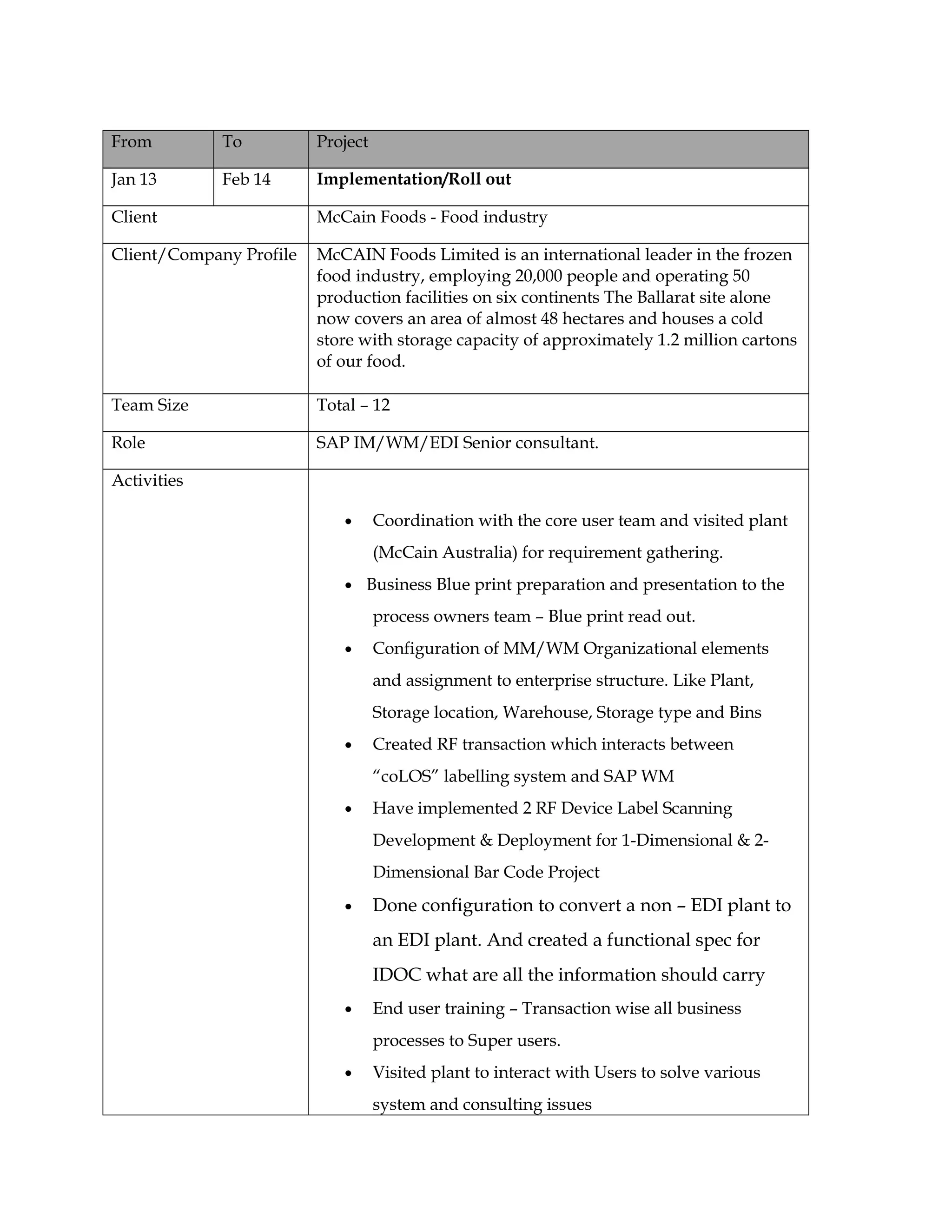 The document provides details about an SAP implementation project for McCain Foods from January to February 2014. A team of 12 consultants worked on configuring SAP modules including MM, WM, and EDI. Key activities included requirements gathering, blueprint preparation, module configuration, RF device implementation, converting the plant to EDI, end user training, testing, issue resolution, and knowledge transfer. The client, McCain Foods, is an international frozen food leader operating 50 plants globally including a large facility in Ballarat, Australia.