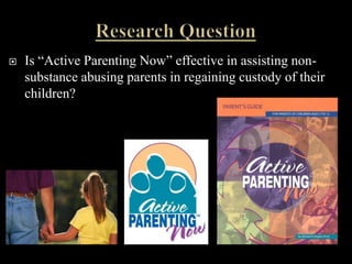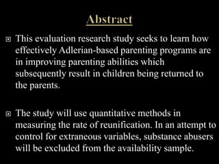 This evaluation research study seeks to determine the effectiveness of Adlerian-based parenting programs, such as Active Parenting Now, in improving parenting skills and allowing parents to regain custody of their children. The study will use quantitative methods to measure the rate of reunification among parents who complete the Active Parenting Now program, excluding substance abusers. The goal is to determine if completion of Active Parenting Now predicts parents regaining custody of their children.