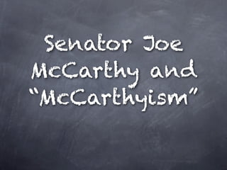 The document discusses Senator Joseph McCarthy and the era of McCarthyism in the 1950s, including details about McCarthy's life, political career, and his infamous 1950 speech where he claimed to have a list of 205 communists working for the State Department which led to widespread witch hunts and blacklisting in the United States. McCarthyism ultimately tarnished McCarthy's reputation and legacy before his death in 1957 at the age of 48 from health complications related to alcoholism.