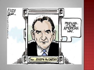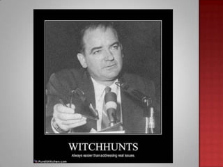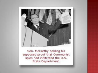 After WWII and during the 1940s-1950s, Joseph McCarthy took advantage of American fears about communism. He developed a list of around 200 government employees he claimed were communist infiltrators. Many people were accused of being communists, including government officials, writers, and entertainers. Their careers were often destroyed. McCarthyism led to paranoia and hysteria before beginning to decline in 1954 when McCarthy died in 1957. It showed how susceptible people can be to accusations and suspicion.