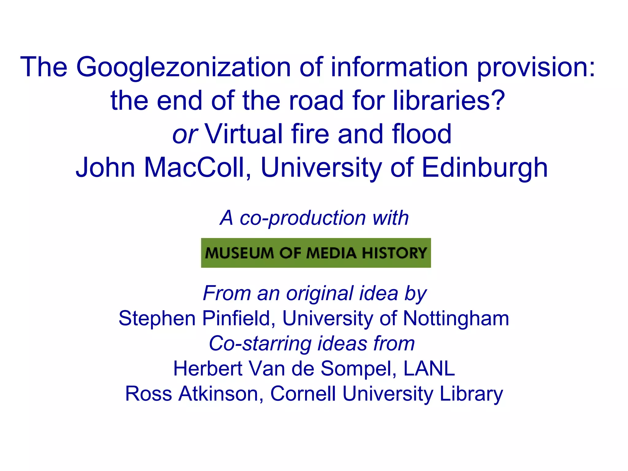 1) The document discusses how libraries are facing challenges from entities like Google and Amazon that are increasingly providing access to information. 2) It notes that libraries are struggling to fulfill their role of ensuring equitable access as it becomes more difficult to optimize their services with constrained resources and inputs. 3) However, it argues that libraries still have advantages in being close to authors and able to archive institutional material. It suggests that libraries could learn from Google's approaches but also build their own alternative system, dubbed "LibraryZone", to ensure their long term role by pooling resources and thinking boldly about what users need.