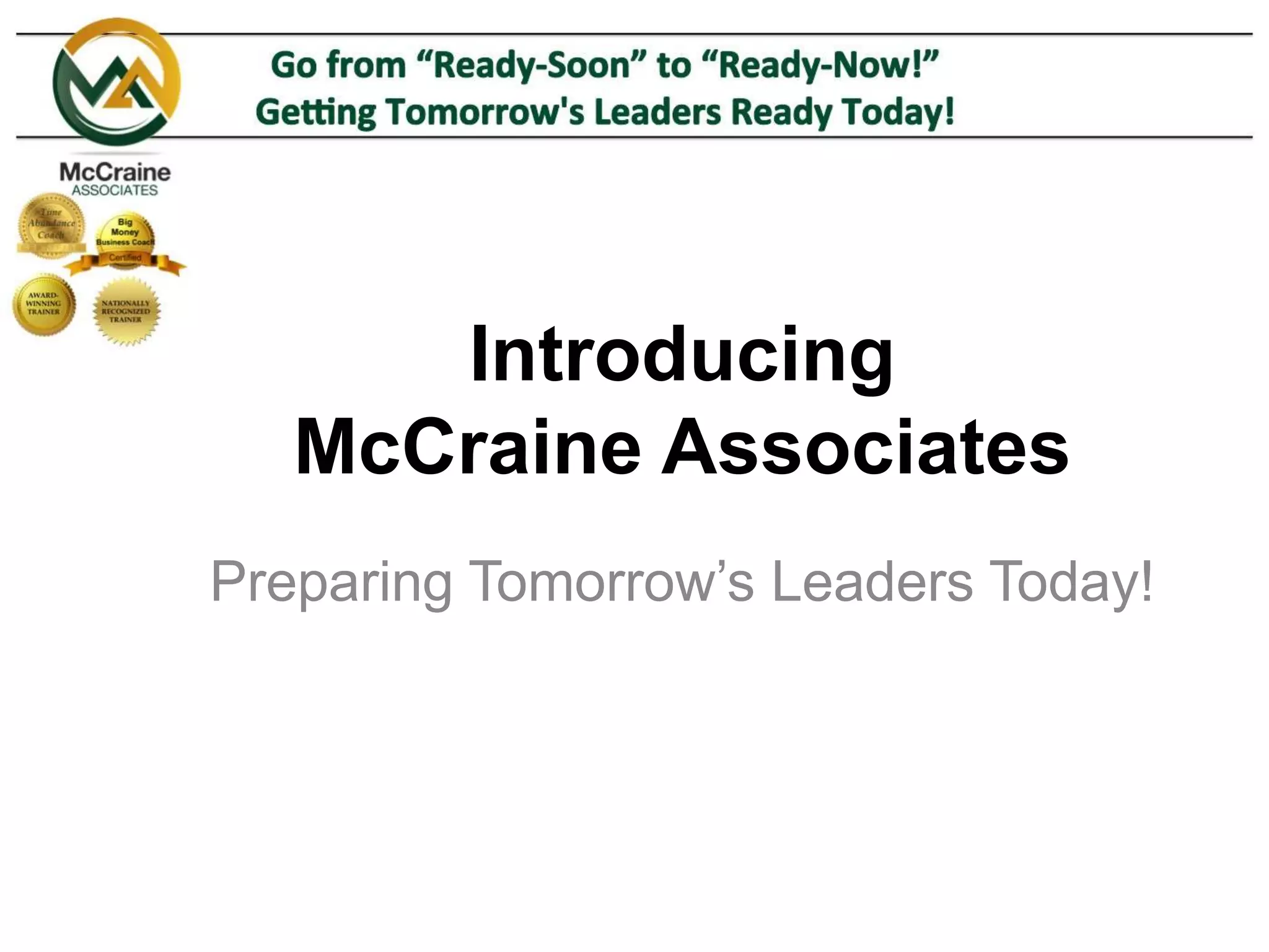 McCraine Associates is a leadership development firm that prepares future leaders for key executive roles. They work with both individual leaders and businesses. For businesses, they provide training, facilitation and group coaching to groom emerging leaders. Their statistics show that most businesses do not adequately plan for leadership succession and development, which can negatively impact financial performance. McCraine defines objectives, does discovery on client needs, designs and implements customized solutions, and provides ongoing coaching and feedback to help clients reach their goals of developing strong, effective leaders.