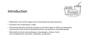 McDonald's entered the Indian market in 1996 and has since seen success through adapting its operations to local tastes and preferences. It established a 50-50 joint venture with Indian partners and changed its menu to be more vegetarian-friendly. McDonald's also uses a localized marketing strategy, including affordable pricing, promotions targeting children, and widespread locations. Through adapting its operations while maintaining quality standards, McDonald's has become a major fast food brand in India's competitive restaurant market.
