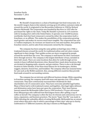 McDonald's is the world's largest chain of hamburger fast food restaurants, serving over 64 million customers daily in 119 countries. It began in 1940 in San Bernardino, California and was founded as a corporation by Ray Kroc in 1955. McDonald's has over 33,000 locations worldwide owned by the corporation itself, franchisees, or affiliates. It has 1.5 million employees and generates revenue through franchise fees and sales in corporate-owned restaurants. The company is known for its iconic golden arches logo and uses of red and yellow colors.
