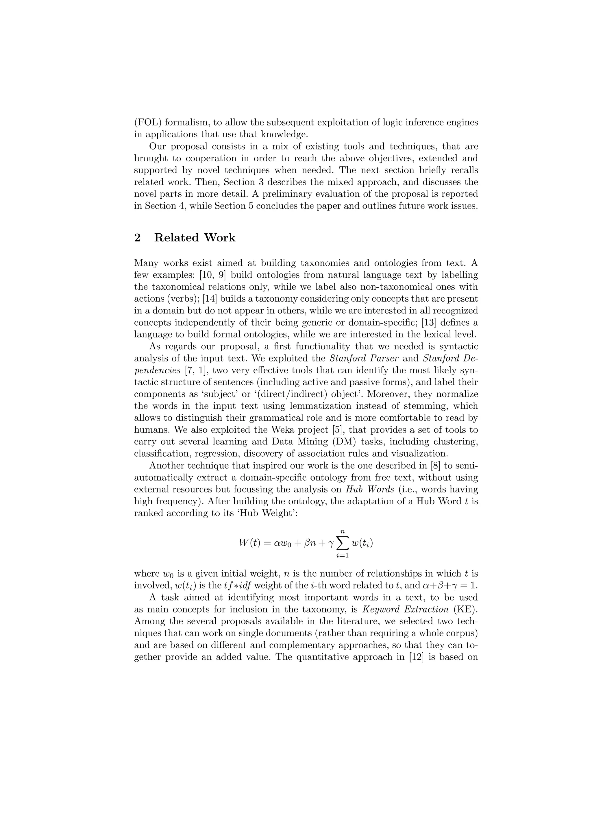 The document proposes a mixed approach using existing natural language processing techniques and novel techniques to automatically construct conceptual taxonomies from text. Key steps include identifying relevant concepts and attributes from text, clustering similar concepts, computing relevance weights for concepts, and generalizing concepts using WordNet. Preliminary results suggest the approach shows promise for extending and improving automatic taxonomy construction.