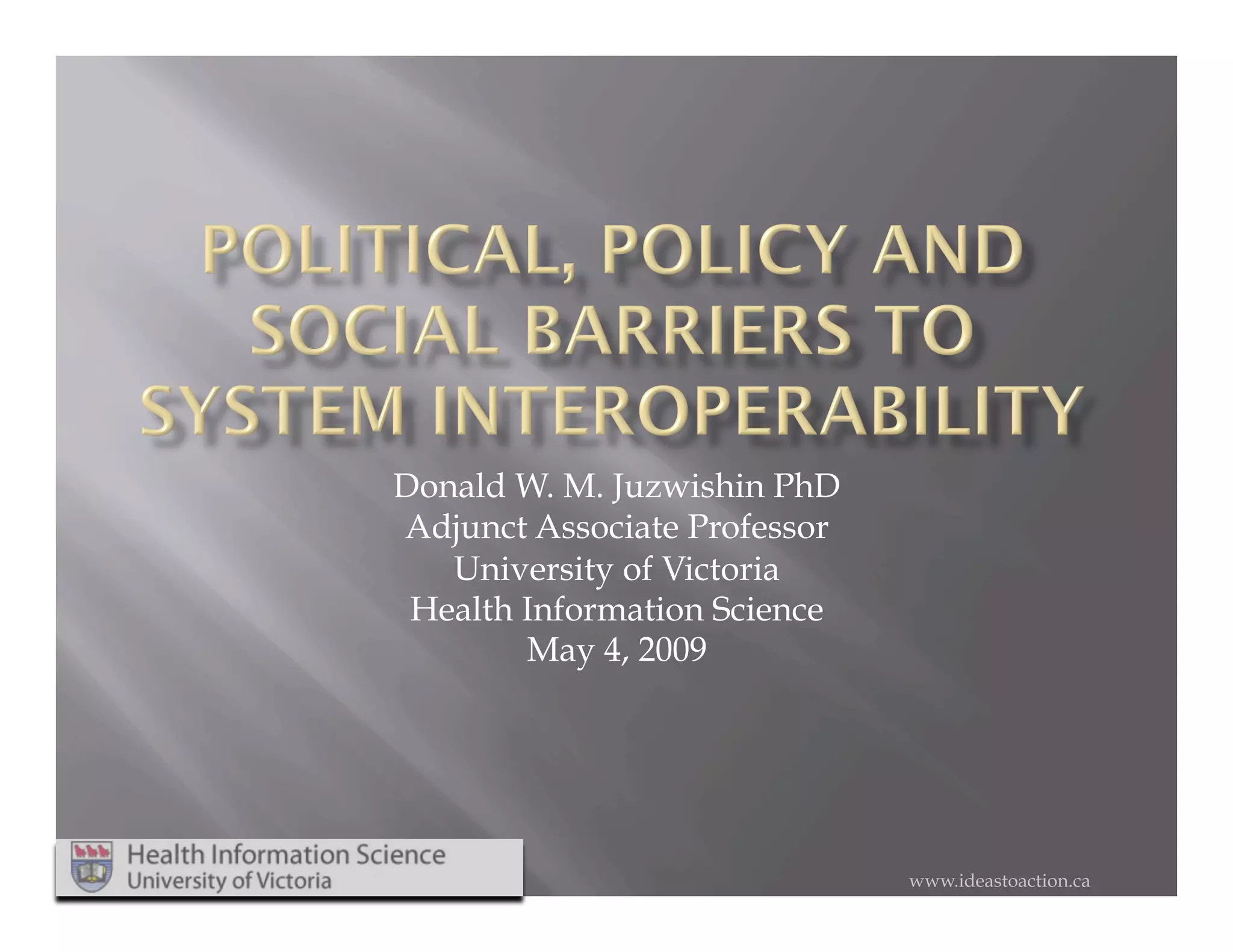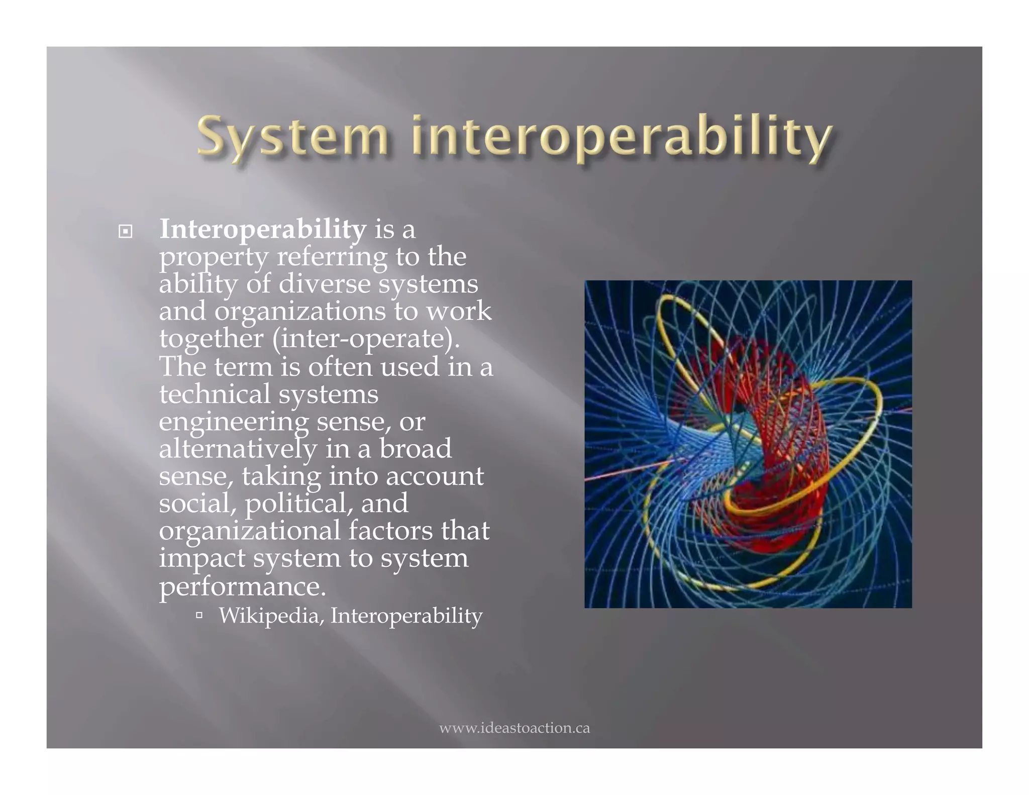 The document discusses interoperability in health care systems and the need to design systems that are sustainable given increasing demands and limited resources. It argues that health care must be reinvented and that technical systems have social consequences and vice versa, so sociotechnical systems must be designed with an understanding of how people and technologies interact. The document also notes that progress on health information systems in Canada has been slow.