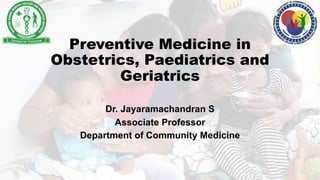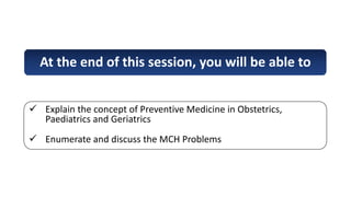 The document discusses preventive medicine in obstetrics, pediatrics, and geriatrics, focusing on maternal and child health (MCH) concepts and objectives such as reducing mortality and promoting physical and psychological development. It emphasizes the interconnectedness of maternal and child health, detailing problems like malnutrition, infections, and uncontrolled reproduction, while outlining direct and indirect interventions to improve health outcomes. The author highlights the importance of social factors in reproductive health and the role of preventive pediatrics in community health care services.