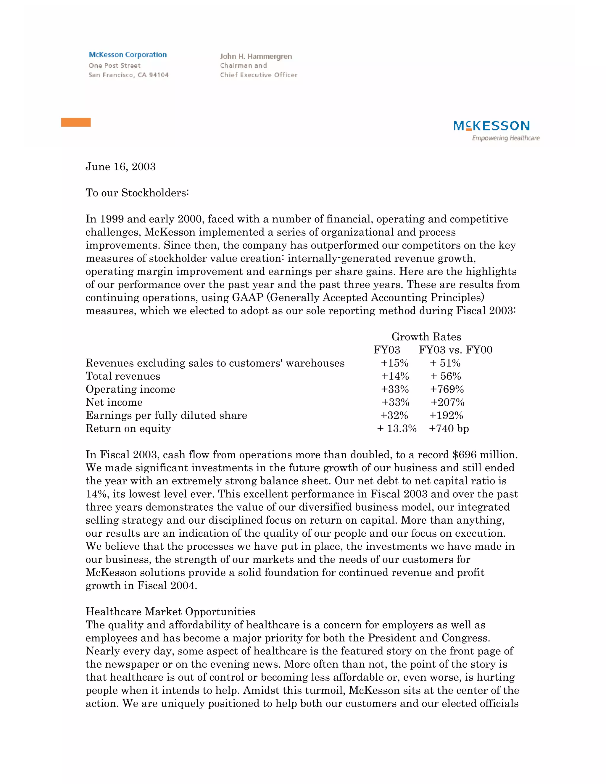The document is a letter from the CEO of McKesson to stockholders summarizing the company's financial performance over the past year and three years. It highlights significant revenue and profit growth across key metrics like revenues, operating income, net income and EPS. It also discusses how McKesson is uniquely positioned in the healthcare industry to help address issues of quality and affordability of care through innovative solutions and technologies. The CEO expresses confidence that McKesson is well-positioned for continued growth given market opportunities, its differentiated strategy and strong execution.