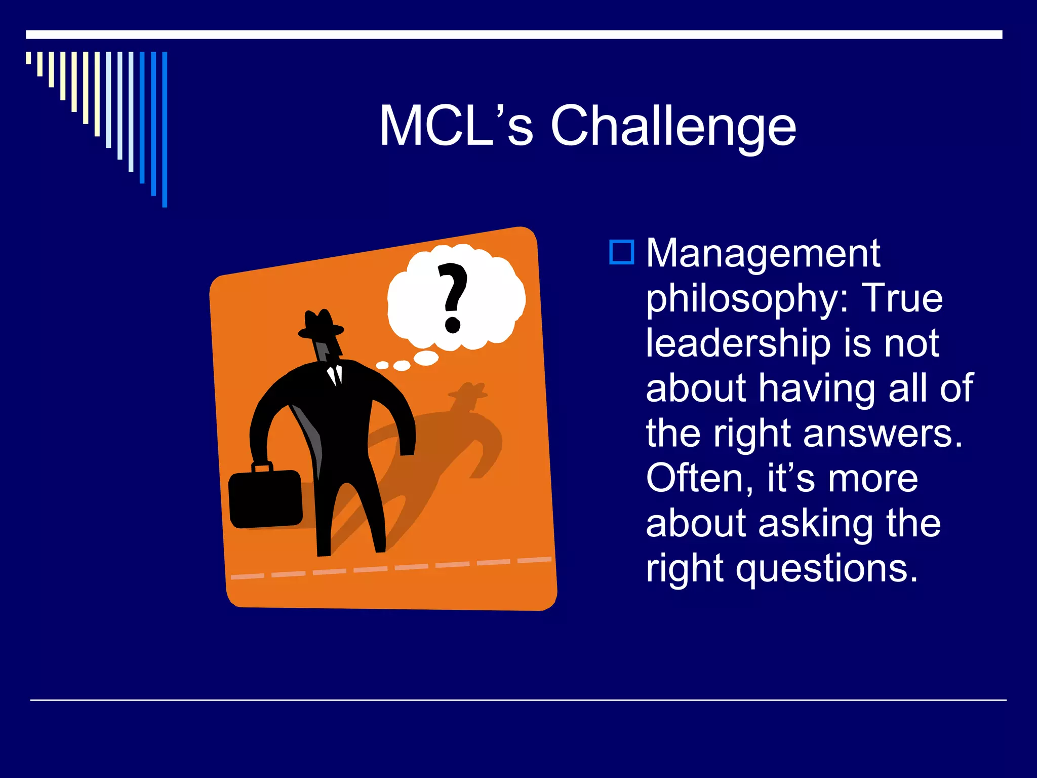 The document outlines MCL's challenge management philosophy emphasizing leadership through inquiry rather than just providing answers. It details various outreach and collaborative initiatives aimed at building community engagement and inclusivity, as well as highlights MCL's commitment to innovation and cultural diversity. The narrative underscores the importance of adaptability and effective service in libraries to foster a sense of belonging and global citizenship.