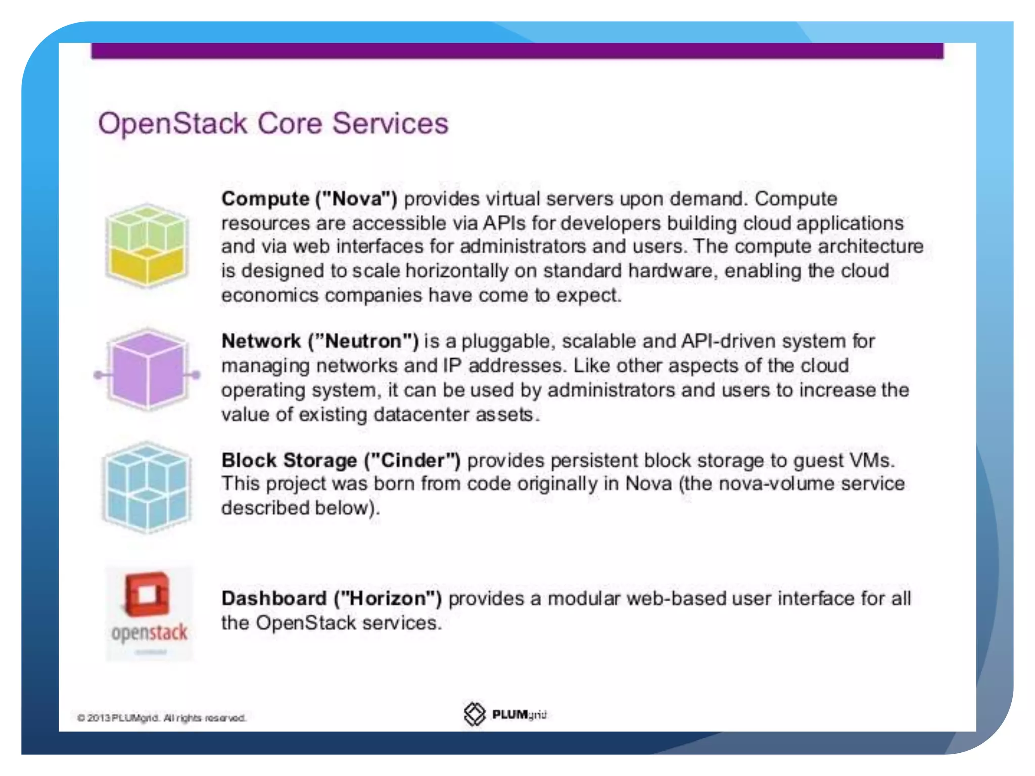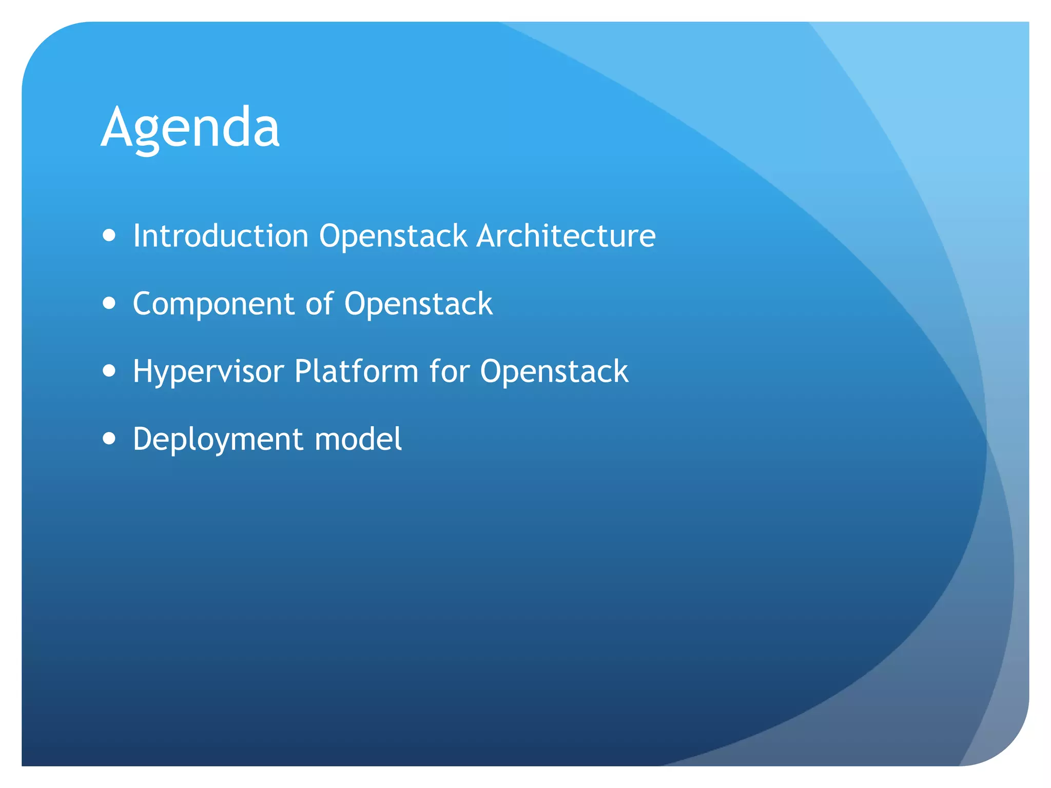 Openstack is an open source cloud operating system that manages large pools of compute, storage, and networking resources. It consists of several components including Nova (compute), Neutron (networking), Glance (images), Keystone (identity), and Cinder (block storage). The major hypervisor options supported by Openstack are KVM, XenServer, and vSphere. Common deployment models include a basic 3 node architecture with separate controller and compute nodes, or a scaled compute-only environment.