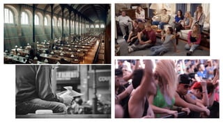 The document discusses how different media and technologies shape our experiences and culture in different ways. It contrasts tribal/oral cultures with print/rational cultures and notes we are currently in a transition between those. It provides questions about what a technology enhances, displaces, recovers, or becomes when taken to an extreme. It quotes that the electric environment results in an absence of secrecy and discontinuity. It recommends further reading on these topics.