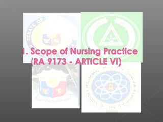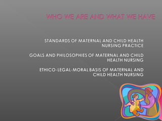 The document discusses the goals, standards, and legal basis of maternal and child health nursing. The primary goal is to promote and maintain optimal family health to ensure healthy childbearing and childrearing. Maternal and child health nursing must be family-centered, community-centered, and research-oriented according to common standards that aim to protect patient safety, autonomy, and privacy.