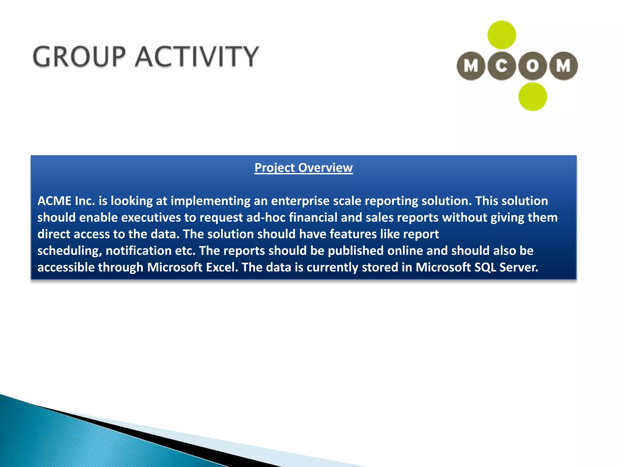 This document provides an overview of an IT business analyst career training module that covers topics such as: an introduction to business analysis and the IT business analyst role; the Rational Unified Process (RUP) methodology; requirements management; and the RequisitePro requirements management tool. The module includes sessions on requirements elicitation techniques like Joint Application Design (JAD) sessions. It also outlines an activity for a sample project to identify reporting requirements for an organization.