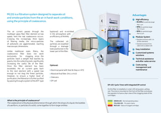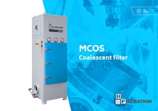 The document describes the MCOS coalescent filter system, which effectively separates oil and smoke particles from the air using a multi-layer glass fiber filter and the principle of coalescence, achieving an efficiency rate of 99.99%. It features a DP-LED cyclic timer to indicate the clogging state of cartridges and is designed for various applications, including CNC machine tools and general mechanical machining. The system offers modular configurations with custom solutions and is easy to install with technical support available.