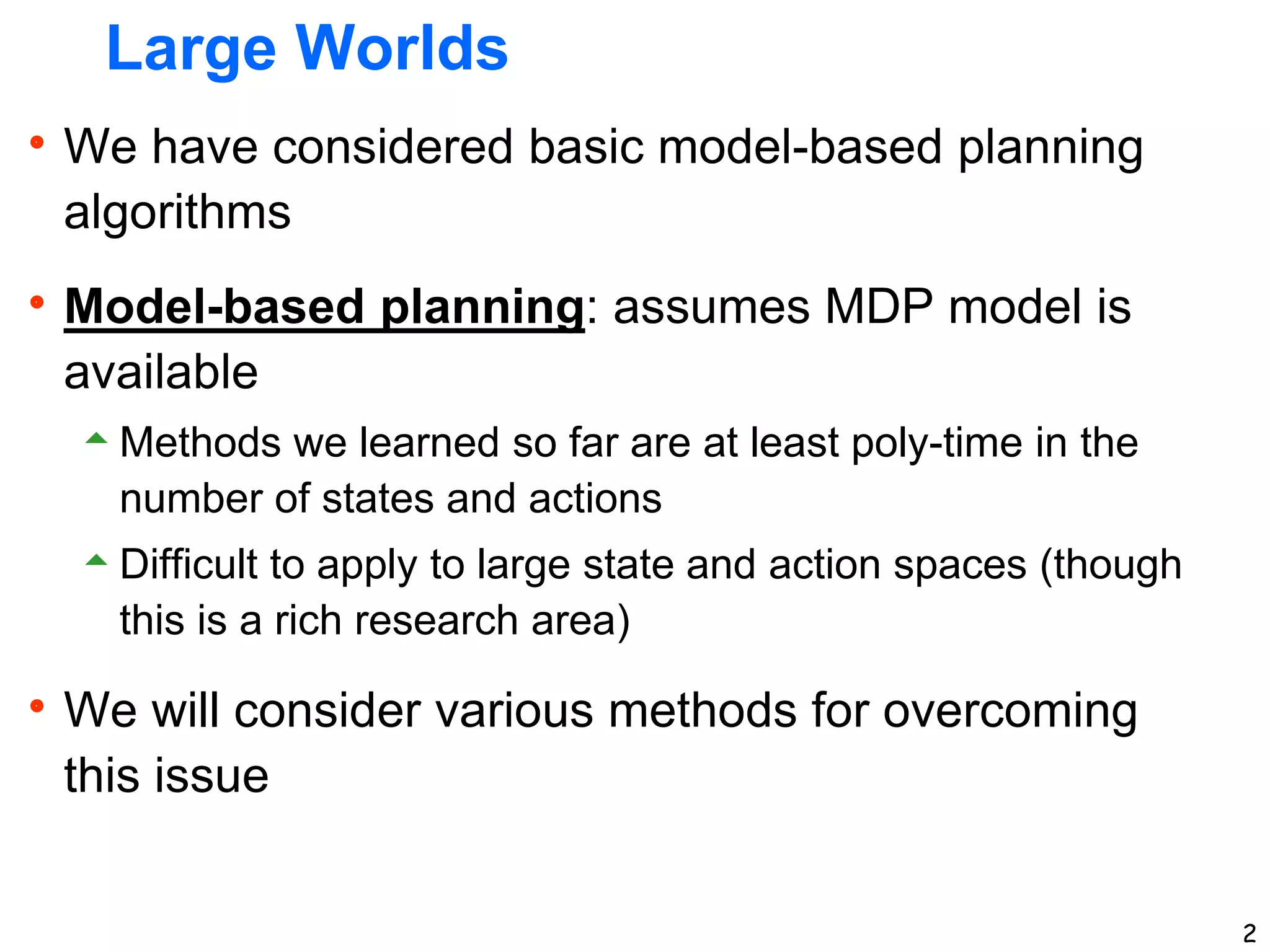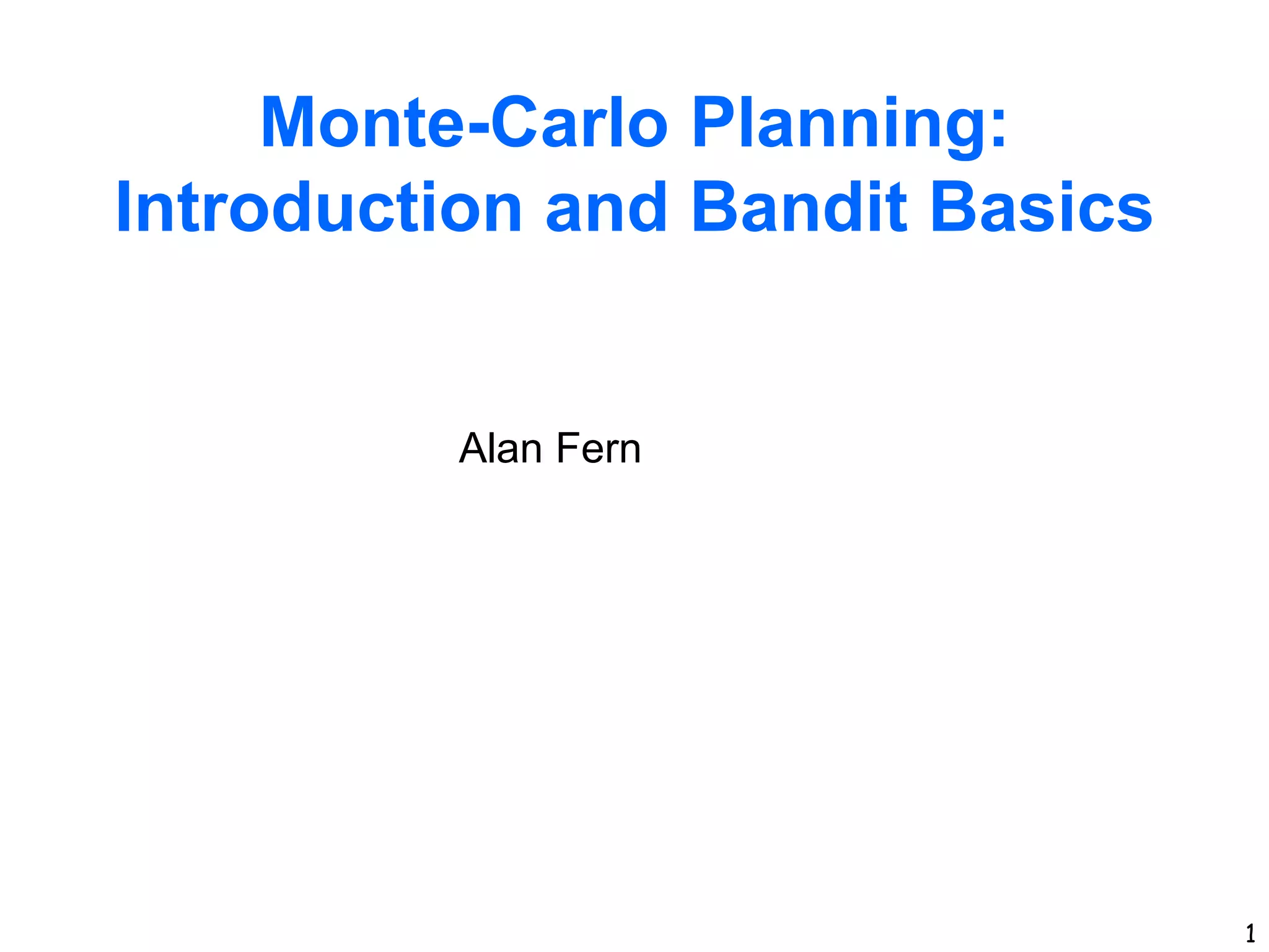 The document discusses approaches for planning in large worlds, including Monte-Carlo planning. It introduces the concept of a multi-armed bandit problem where an agent must choose between multiple actions with unknown rewards. The UniformBandit algorithm is analyzed, which pulls each arm a fixed number of times and selects the arm with the highest average reward. It is shown that by setting the number of pulls per arm appropriately, UniformBandit can be made into an efficient Probably Approximately Correct algorithm for the multi-armed bandit problem.