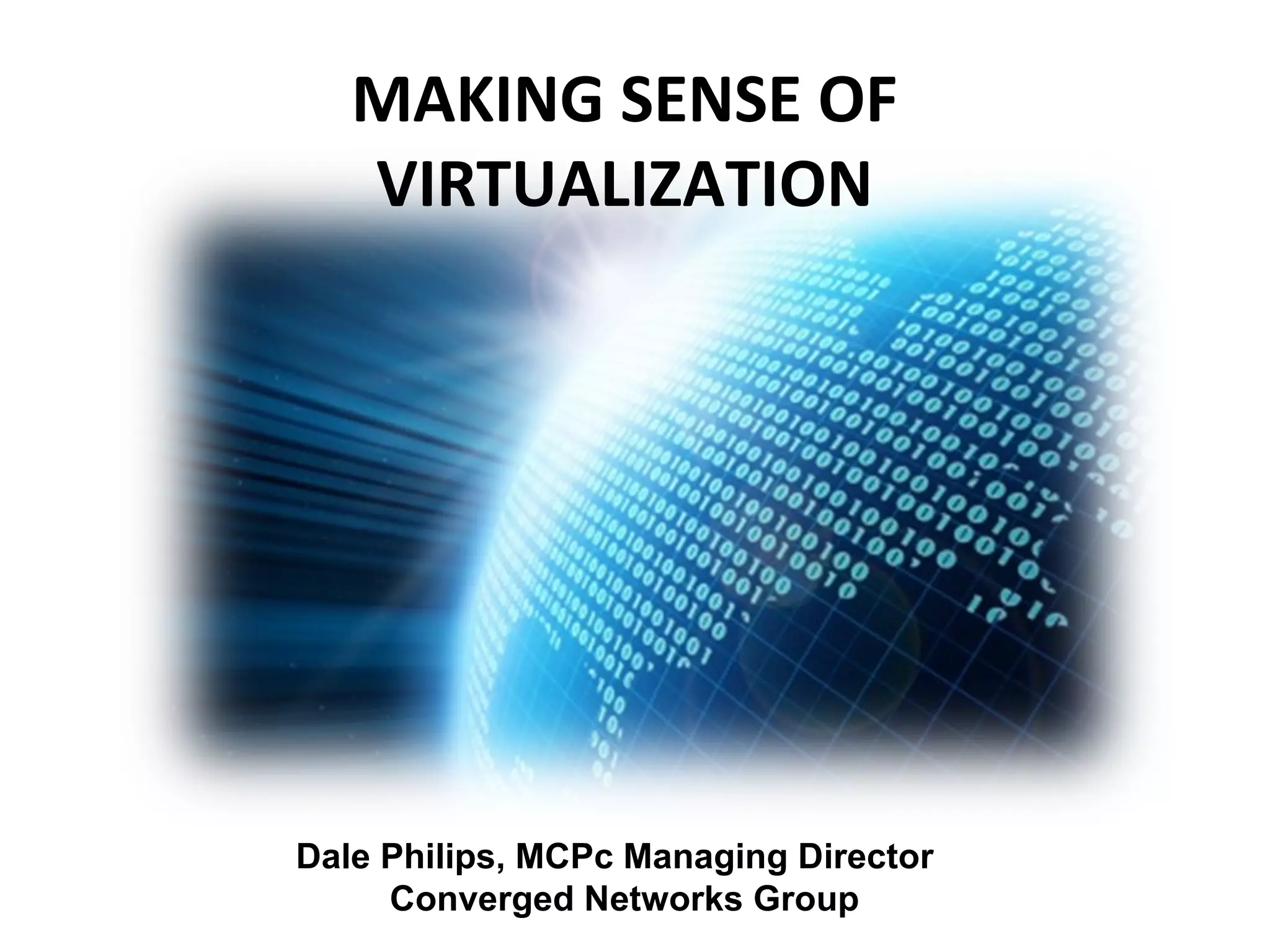 The document discusses the benefits and trends of virtualization technologies. It notes that virtualization can help improve server utilization and reduce IT costs through server consolidation. It also discusses how virtualization allows for centralized management of desktop environments. The document outlines different types of virtualization including server, application, and desktop virtualization and how these technologies are enabling more efficient IT infrastructure solutions.