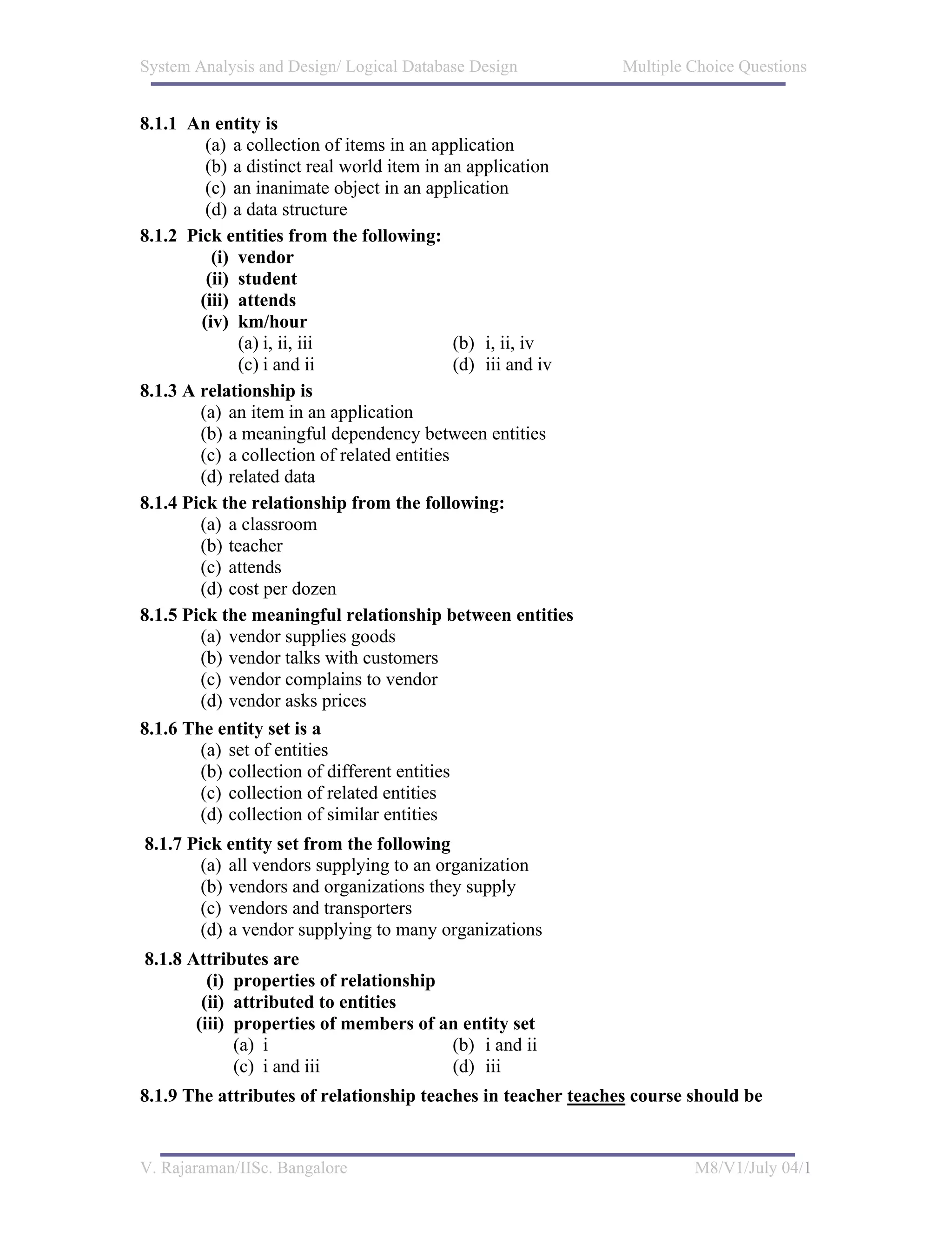 The document contains a series of multiple choice questions about logical database design concepts including entities, relationships, attributes, entity sets, normalization, and the entity-relationship (E-R) model. Specifically, it tests understanding of what constitutes an entity versus a relationship, how they are represented in an E-R diagram, the meaning of attributes, relationships between entities, and the goals and processes involved in normalization of relations.