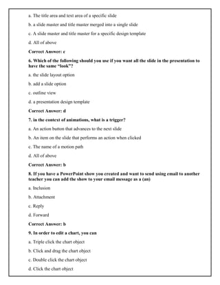 This document contains 60 multiple choice questions about Microsoft PowerPoint. The questions cover a range of topics including adding different file formats and sound effects to presentations, using different views like slide sorter and outline view, customizing slide masters and layouts, applying animations and transitions, and printing and sharing presentations. The correct answers are provided after each question.