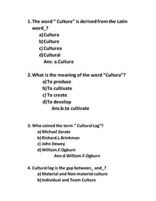 This document contains a multiple choice quiz on concepts related to knowledge, curriculum, and culture from philosophical and sociological perspectives. The quiz covers terms like "cultura", cultural lag, cultural inertia, cultural diffusion, material and non-material culture. Cultural lag refers to the gap between material and non-material culture. Key thinkers discussed include William Ogburn who coined the terms "cultural lag" and Michael Zarate who coined the term "cultural inertia".