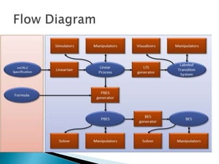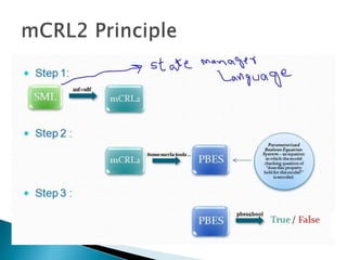 The document provides an overview of MCRL2, a specification language for modeling, verification, and validation of systems using processes, which can carry data and time parameters. It details various components including labeled transition systems (LTS), linear process specifications (LPS), and parameterized boolean equation systems (PBES), along with examples like vending machines, login systems, and car parks. The document discusses operators, data structures, and allows process interactions while managing complexity in representations.