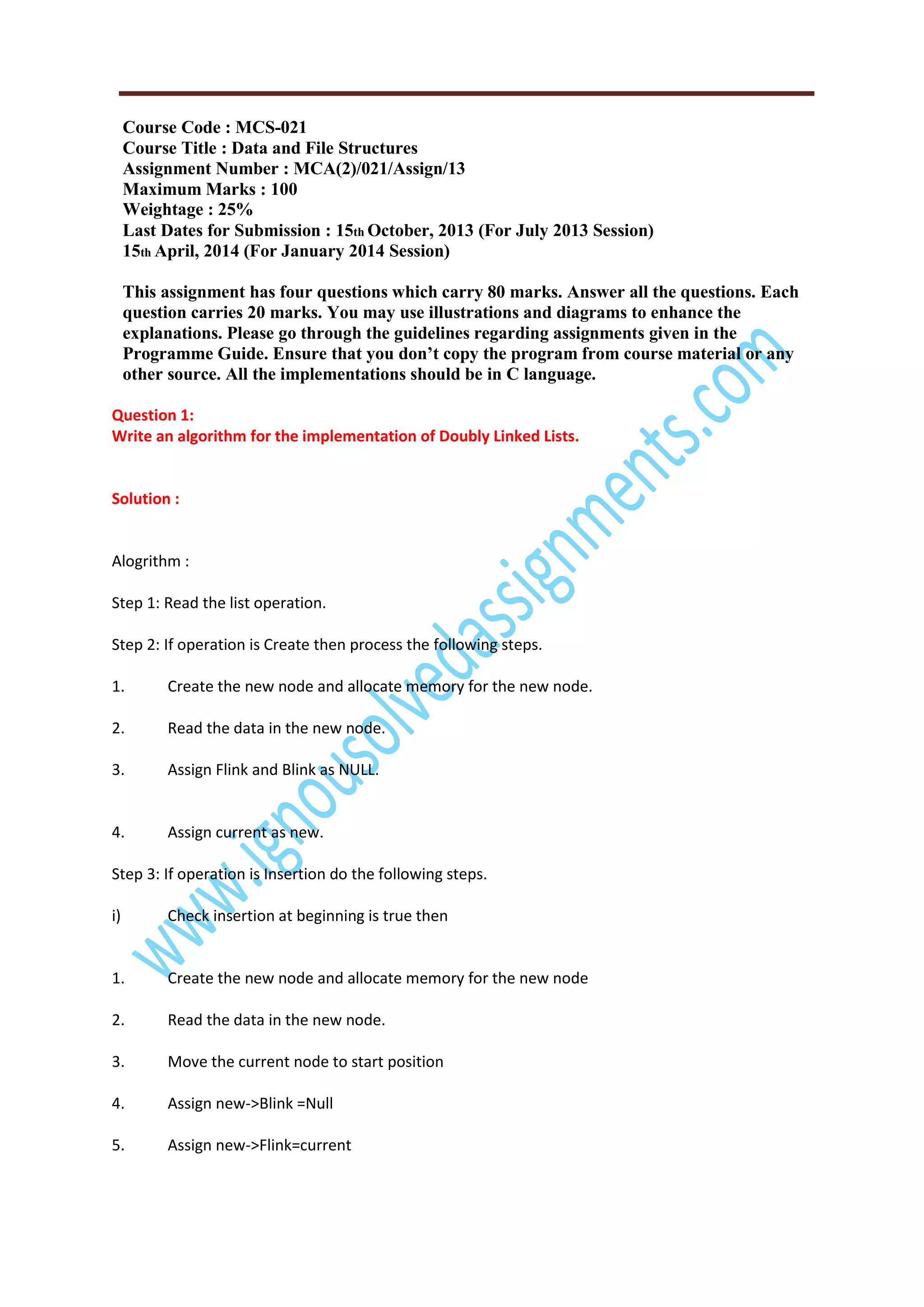 This document provides instructions for an assignment on data and file structures for the MCS-021 course. It outlines four questions to answer for the assignment, which is worth 100 marks total and 25% of the course grade. Students must answer all four questions, with each question worth 20 marks. The assignment should be submitted by October 15th, 2013 for the July 2013 session or April 15th, 2014 for the January 2014 session. Question 1 asks students to write an algorithm for implementing doubly linked lists.