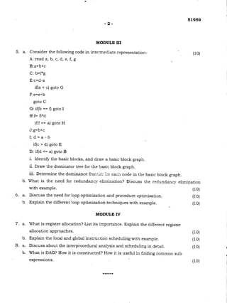 4) Optimization techniques including register allocation, instruction scheduling, common subexpression elimination, and interprocedural analysis