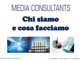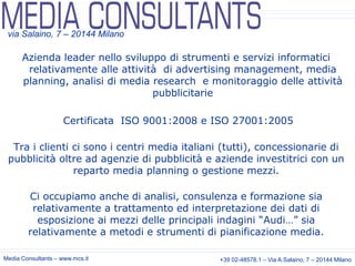 Media Consultants è un'azienda di riferimento nel settore della pubblicità che offre strumenti e servizi per la gestione della pianificazione dei media, monitoraggio e analisi delle campagne pubblicitarie. Con oltre 40 professionisti esperti e un'ampia banca dati di veicoli media, forniscono consulenza, formazione e supporto tecnico ai clienti, tra cui centri media e concessionarie pubblicitarie. L'azienda è certificata ISO e sviluppa software per ottimizzare il processo di pianificazione e gestione delle campagne pubblicitarie.