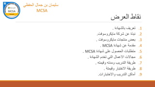 توفر الشهادة MCSA من مايكروسوفت تأهيلاً احترافياً في إدارة الأنظمة والشبكات، حيث تتطلب اجتياز عدة امتحانات. تغطي الشهادة متطلبات تشغيل أنظمة مايكروسوفت وتطبيقاتها، وتعتبر ذات قيمة عالية في سوق العمل. مايكروسوفت، إحدى أكبر شركات التقنية، تأسست عام 1975 وتقدم مجموعة واسعة من المنتجات والخدمات.