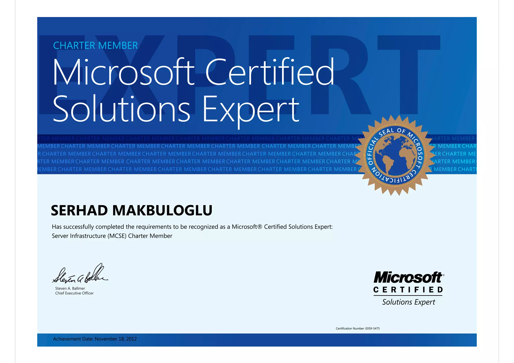 This document certifies that Serhad Makbuloglu has successfully completed the requirements to become a Microsoft Certified Solutions Expert in Server Infrastructure. As a charter member, they were among the first to achieve this certification when it was created in 2012. The certification is signed by Steven Ballmer, Chief Executive Officer of Microsoft.