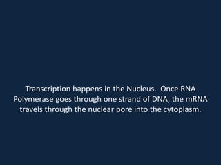Transcription occurs in the nucleus, where RNA polymerase copies DNA into mRNA. The mRNA then exits the nucleus through the nuclear pore and enters the cytoplasm. In the cytoplasm, ribosomes use the mRNA as a template to assemble amino acids specified by the mRNA into a polypeptide chain through translation.