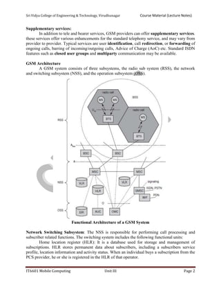 GSM is the most widely used mobile telecommunications system in the world. It uses TDMA to separate each radio frequency carrier into time slots, allowing multiple users to access the same frequency channel. The document describes the key components and protocols of the GSM network architecture including the radio subsystem with base stations and mobile stations, the switching and network subsystem for call routing and mobility management, and bearer, tele and supplementary services provided to users.