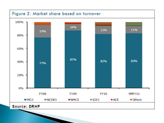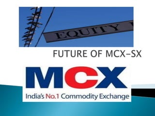 The document discusses MCX Stock Exchange Limited (MCX-SX), India's new stock exchange. It provides details on MCX-SX's operations and regulatory approvals to trade various financial instruments. It also summarizes MCX-SX's competitive membership fees and how it has signed up over 700 prospective members, which could trigger other exchanges like BSE and NSE to revise their own fee structures.