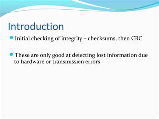 This document discusses the Message Digest 5 (MD5) hashing algorithm. It provides an overview of MD5, including how it works to generate hashes and check integrity. However, the document notes that MD5 is no longer considered secure due to flaws that allow hash collisions to be generated with relative ease. More robust hashing algorithms like SHA or Whirlpool are now recommended instead of MD5.