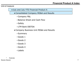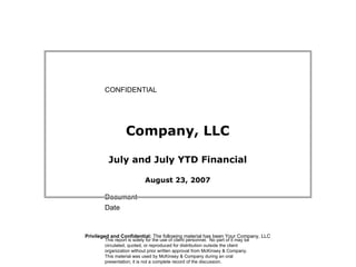 The document provides a financial summary for Company, LLC for July and July year-to-date (YTD). It includes consolidated results, results by business unit, and highlights for Goods 1. Goods 1 sales were unfavorable to budget due to higher fiber costs, but favorable pricing offset some of this. Production and shipments were favorable for Goods 1 YTD.