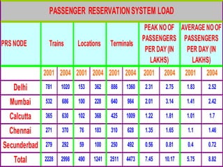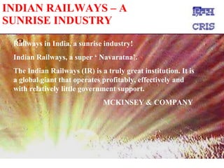 The document discusses information technology initiatives on Indian Railways. It outlines challenges around increasing efficiency and adapting to changes. Current IT systems on the railways are described as legacy applications in need of upgrades. The document then provides details on key IT systems implemented for passenger and freight transport, including the Passenger Reservation System (PRS), Unreserved Ticketing System (UTS), and Freight Operations Information System (FOIS). Future plans are discussed to further expand these systems and improve connectivity across the railway network.