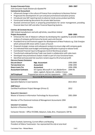 Michael Dineen is an experienced finance manager and accountant seeking new opportunities. He has over 20 years of experience working in finance roles for multinational companies in Ireland. He is academically strong with a Master's in IT for Accountants and certifications in lean systems and project management. Dineen has a proven track record of delivering results and implementing financial reporting solutions.